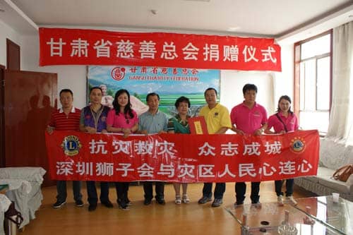 8月16日清晨,深圳狮子会第一副总监郑德刚狮兄从西宁公干归来,来不及稍作休息,携一路风尘,马上带队奔赴甘肃兰州进行救灾物资的交接工作。随行狮友有深圳狮子会纠察长黎文秋狮兄,赈灾及震后重建委员会主席周婷狮姐,第八分区主席林子钰狮姐。救灾物资于8月16日下午顺利抵达兰州。8月17日上午10点钟,郑德刚第一副总监等一行与甘肃省慈善总会会长及相关领导进行了物资交接仪式,救灾物资由甘肃省慈善总会统一统筹安排,即日发往舟曲前线。甘肃省慈善总会负责人对深圳狮子会捐赠救灾物资清单进行了签收,并为深圳狮子会颁发了舟曲救灾《荣誉证书》。其间,甘肃卫视工作人员留下了深圳狮友跋涉千里送物资的珍贵镜头。甘肃省慈善总会负责人对深圳狮子会的爱心善举给予高度赞扬,并代表舟曲受灾群众对深圳狮子会表示衷心感谢。
