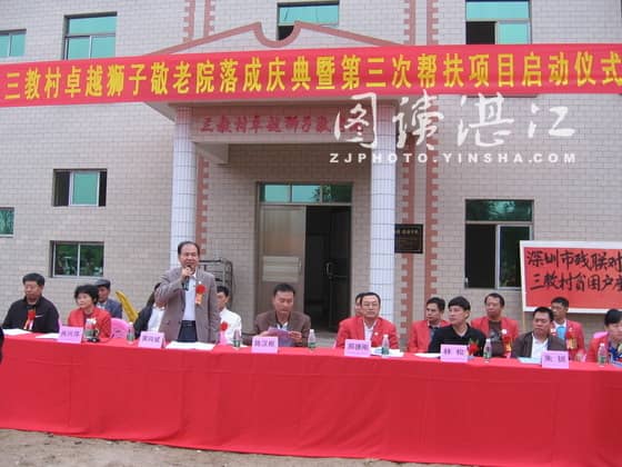三教村卓越狮子敬老院今年8月14日动工,占地面积600平方米,建筑二层楼房面积304平方米,总投资26万元,其中湛江市民政局解决6万元、三教村自筹4万元、深圳卓越集团捐助16万元。该项目12月初已建成,可解决12名老人的居住问题。另外,深圳狮子会捐款2.5万添置物资。