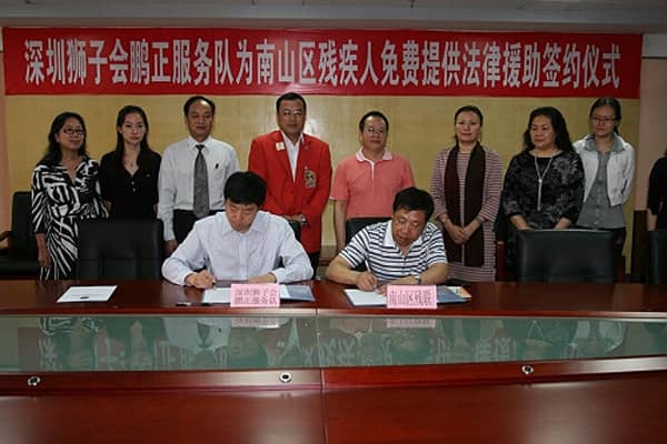 2011年4月15日上午,深圳狮子会郑德刚第一副总监、鹏正服务队杜长荣会长带领狮兄狮姐一行六人来到位于爱心大厦的深圳市南山区残疾人联合会,与南山区残联进行了简单而又隆重的“鹏正服务队为南山区残疾人提供法律援助”的签约仪式。