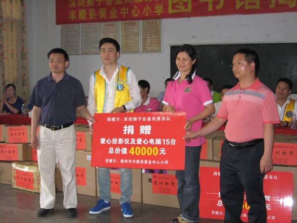黄金镇中心小学地处梅州市丰顺县边远山区,全校共有师生800多人,一直没有图书馆,仅有一间只有几十本陈旧过时图书的阅览室。深圳狮子会皇岗服务队获悉情况后,立即发动30多位狮友积极捐款,并得到姐妹会—广东狮子会慈爱服务队和香港港南狮子会狮友的积极响应。 经过近两个月的精心准备,狮友们先后采购了3000多册图书、一批电脑和投影仪,还有一些深受师生欢迎的体育用品,同时还为该校六位贫困的单亲家庭学生准备了助学金,总计价值十多万元,与此同时我们还将学校原本破旧不堪的阅览室重新扩建并装饰一新,成为一座整洁漂亮的新图书馆。