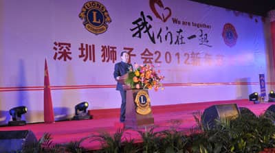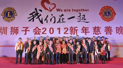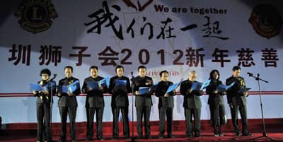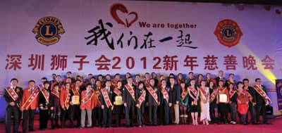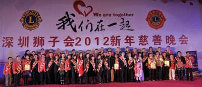 2011年12月18日,深圳狮子会的年度盛会“我们在一起——深圳狮子会2012新年慈善晚会”在深圳会展中心五号馆隆重举行。中国狮子联会、深圳市委、市政府、市政协、市民管局、市残疾人联合会、市关爱办、市慈善会、市文联等单位的领导,以及广东、青岛、北京、沈阳、陕西、香港和深圳狮子会的狮友九百多人欢聚一堂,喜迎新年。