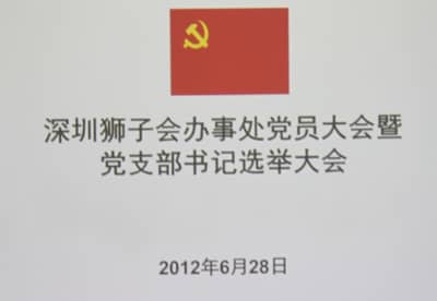 2012年6月28日上午,深圳狮子会办事处党员大会暨党支部书记选举大会在深圳狮子会办事处召开。深圳狮子会业务主管单位深圳市残联党委书记黄纯斌、办公室主任姚群、党办秘书陈向荣,深圳狮子会2011-2012年度总监郑德刚、2012-2013年度候任总监苏泽然、秘书长张晓玮及深圳狮子会办事处全体党员出席了该会议。