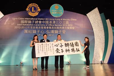 8月12日晚,港澳303区就职典礼在香港会议展览中心大会堂隆重举行。深圳狮子会2012-2013年度总监苏泽然狮兄,第二副总监林子钰狮姐,前总监王锦良狮兄、孙蕴狮姐,资政徐非狮兄及松岗、百合服务队等狮友出席。苏泽然总监向港澳303区赠送了一副以港澳303区本年度主题“团结狮子心,弘扬狮子爱”为内容的书法作品,祝愿港澳303区与深圳狮子会狮谊永固。