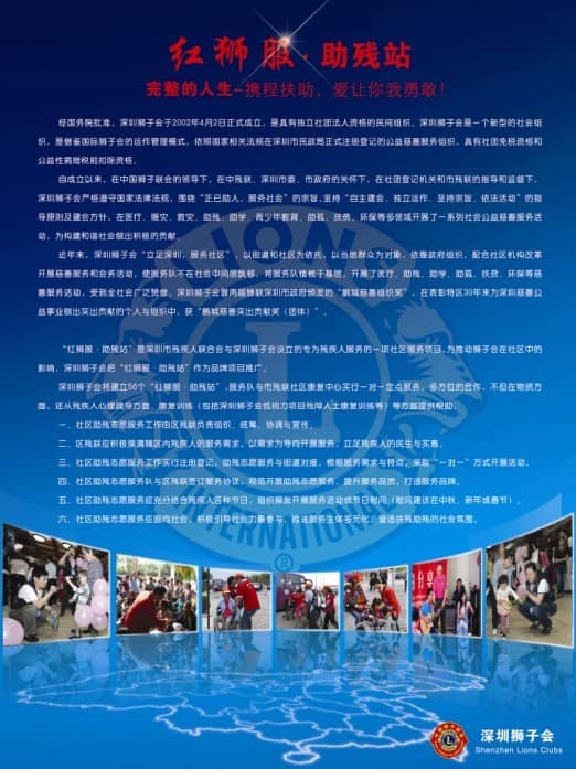“红狮服•助残站”是深圳市残疾人联合会与深圳狮子会设立的专为残疾人服务的一项社区服务项目。为推动狮子会在社区中的影响,深圳狮子会2012-2013年度把“红狮服•助残站”作为品牌项目推广。