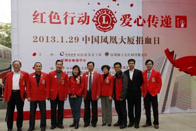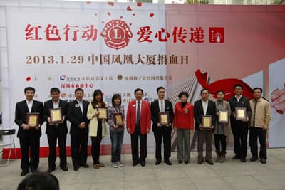 2013年1月29日,由深圳狮子会、深圳血液中心联合主办,深圳狮子会红树湾服务队、安信证券义工队、中国凤凰大厦管理处、凤凰卫视义工队、渣打银行(中国)有限公司、凤凰菁英汇、财富证券、国元证券等联合承办的“红狮服•红色行动”公益献血活动成功举行。本次活动成功献血231人,采血量77,500毫升。这是福田中心商务区首次大规模公益献血活动,也是深港两地爱心企业的一次公益合作。深圳狮子会2012-2013年度总监苏泽然狮兄及众多狮友、深圳血液中心副主任卢亮、各承办单位代表出席了活动。