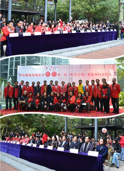 第一届“中信物业捐血周”于2013年1月13日上午9点30分正式启动。此次捐血周活动由深圳狮子会滨河服务队、中信物业联合承办,深圳市中信物业管理有限公司服务管理的中信红树湾、中信海阔天空雅居、中信大厦、中信湾上六座首批共四个物业参与协办的大型公益活动。深圳狮子会2012-2013年度总监苏泽然、第一副总监吴晓明、第二副总监林子钰、秘书长张晓玮、常务副秘书长高洲、第二分区主席兼红色行动执行主席冯其江、滨河服务队会长孙晓炜等狮友,深圳市血液中心卢亮副主任、蓝欲晓副主任等嘉宾出席本次捐血周启动仪式。启动仪式还安排了红树湾培基幼儿园的小朋友演出芭蕾舞《小爱丽丝》,活泼可爱的她们,让我们看到了祖国下一代的朝气与希望,愿无偿献血爱心奉献的精神从小就扎根在她们的心中,愿她们成长为国家的栋梁。