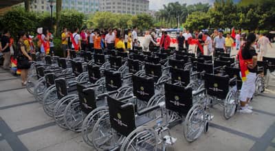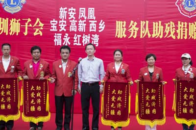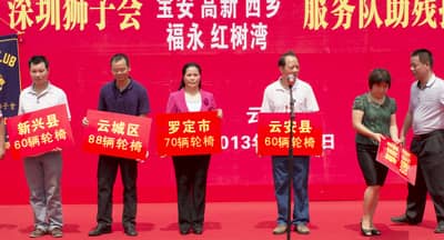 2013年5月19日,第23个全国助残日,今年助残日的主题是:帮扶贫困残疾人。由深圳狮子会宝安服务队主办,高新、红树湾、西乡、福永、新安、凤凰等6支服务队联合协办的云浮助残捐赠活动在云浮顺利举行,向云浮市的残疾人朋友捐赠了价值30万元的358辆轮椅。深圳狮子会狮友及家属共50多位,云浮市残联领导、云浮助残志愿者、残疾人代表共250多位出席本次捐赠活动。