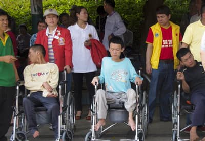 当见到接送残友的大巴抵达现场时,狮友们忙过去帮忙搀扶或抱着残友下车,用轮椅把残友推到会场中间。残友听着狮友们关切的话语,看着狮友们亲切的笑容和热情的举动,禁不住流下泪水。