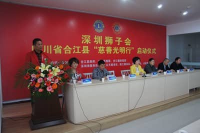 2013年11月中旬, 深圳狮子会深圳湾服务队、海上云天服务队、观澜服务队、和平服务队、启航服务队的40多名狮友们带领医疗专家,携着医疗设备、物资来到四川省泸州市合江县建欣医院, 为当地白内障患者免费进行免费白內障复明手术120例,此次活动得到了当地政府及社会的热烈欢迎和感谢。
