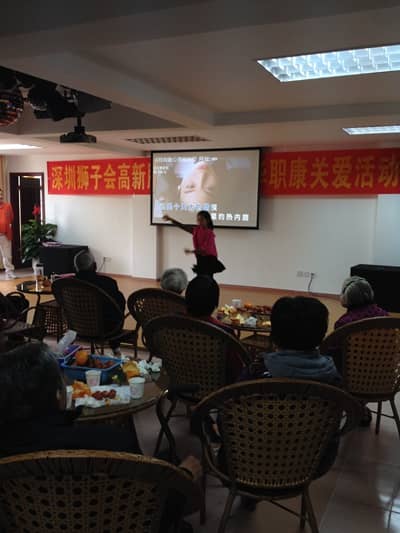 在敬老院布置的舞台上,深圳狮子会2013-2014年度第二副总监林桃代表深圳狮子会及高新服务队祝老人们身体健康,残疾朋友生活愉快。