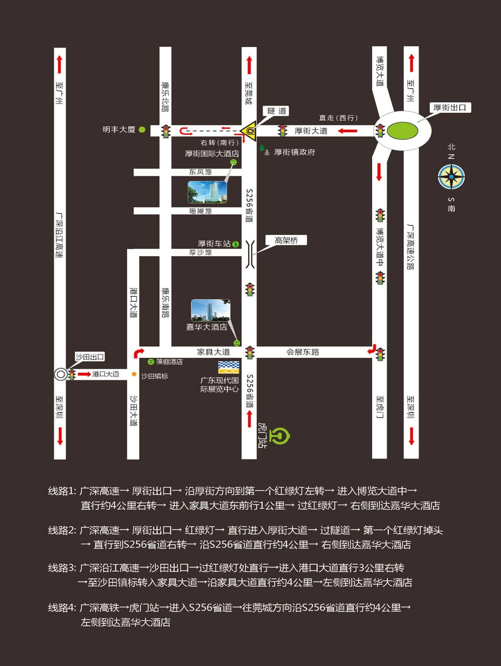 广东嘉华大酒店 (地址:东莞市厚街家具大道1号,电话:0769-85928888,行车路线见附件)
