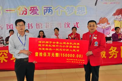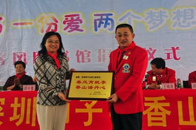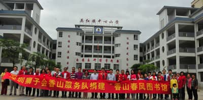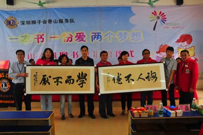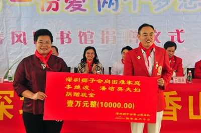 2014年5月10日上午10时,深圳狮子会香山服务队40多位狮友与社会热心人士前往广东英德市英红镇中心小学开展 “春风图书室”捐赠活动,共捐助价值15万元的图书及配套设施,捐助1户困难家庭1万元现金。深圳狮子会前总监王锦良携70多岁的妈妈、英德市副市长罗振宇、省民进常委陈丽霞、英德教育局及英红镇等单位领导参加本次捐赠活动。