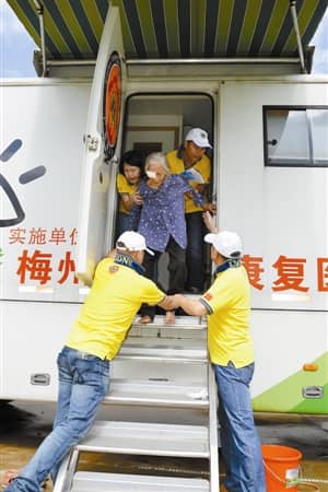 7月9日上午,深圳狮子会宏阳服务队的30多名狮友登上光明快车,冒着暴雨来到河源市龙川县登云镇的残疾人医院,免费为当地60多名白内障患者送上关爱,帮助他们重见光明。(王晓芳)