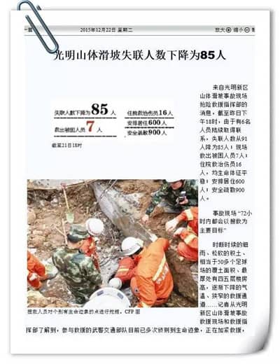 据了解,此次灾害滑坡覆盖面积约38万平方米,余泥渣土厚度达数米至十数米不等,造成附近的恒泰裕、柳溪、德吉程三个工业园33栋(间)建筑物被掩埋或不同程度损毁。这次灾害造成的失联人数,由此前的91人下降为85人。现场救出被困人员7人,住院救治伤员16人,生命体征平稳/安排居住600人,安全疏散900人。灾害共造成33栋建筑物被掩埋或不同程度损坏,覆盖面积约38万平方米。宝安服务队杨勇狮兄的公司就在事发工业区,滑下来的泥土距离他公司只隔一栋厂房。工厂目前停工,员工全部安全撤离。得此消息,深圳狮子会立即发出“关爱12·20光明滑坡受灾狮友的倡议”通知,并倡议各服务队将有受灾狮友的情况及时上报应急援助委员会。