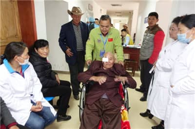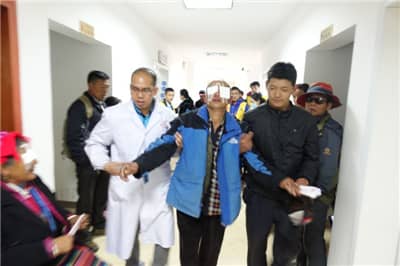 进藏之路是一个大难题,5月14日,援藏医疗队凌晨4点起床,乘飞机从成都飞抵林芝,一路翻山越岭,最高的一座山达4900多米,大家克服了高原反应,直到晚上23:40才到达察隅。从成都出发算起,大家已走了近20个小时。途中,在车辆行驶到古玉乡时,村民们抬着一个92岁的老人出来求诊,老人有一个愿望,希望能让自己的眼睛有两三天光明,见见自己的儿孙。医生们马上下车,在狮友们手机灯光的照射下为老人检查,老人被确诊为白内障。次日早上即把老人送往县人民医院进行手术。