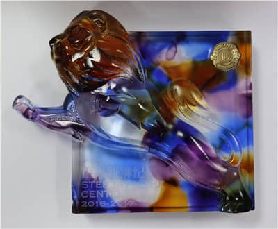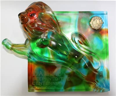 《迈入新狮纪》琉璃作品以东方文化“天方”为基础创意,劲狮跃出方天之框暗喻跨越与创新。每尊作品采用传统古法琉璃经数十天烧制而成,一物一模,一品一像。古法烧制过程中,色泽自此然涌动,循序数天降温成型后浑然天成,无一重复,为此作品的收藏价值。此文化艺术也秉承传统工艺美术的吉祥文化--作品长203鲁班尺的刻度,“富贵”解析为“繁荣”;高166鲁班尺刻度为“财旺,吉祥文化为“顺科”之意。此作品表达了艺术大师马俐对深圳狮子会公益善念的向上精神的敬意。马俐——唐朝文化集团艺术总监,中国国家工艺美术师,广东省工艺美术大师,深圳市工艺美术行业协会常务理事、专家评审委员会委员。曾获第四届“中国工艺美术大师作品暨国际精品博览会”金奖、2004年广东工艺美术大师作品暨名人名作展金奖、深圳市首届“创新杯”工艺品大赛金奖等。