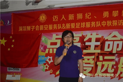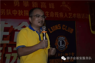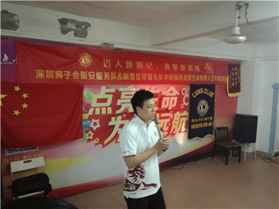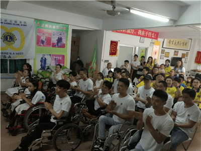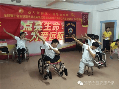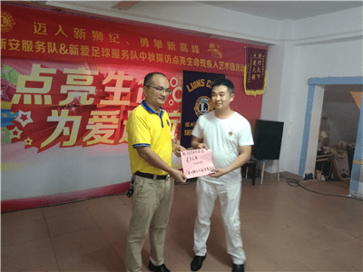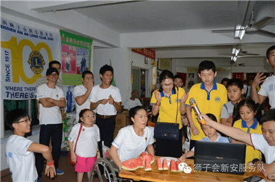 就在厨房各小分队热火朝天忙碌之时,仪式和游戏互动小分队已经在主持人李君狮兄的主持下开始了丰富的互动慰问仪式。在奏国歌和狮子歌之后,新安服务队2016-2017年度队长伍文康狮兄致辞,对艺术团的朋友们进行中秋慰问。新安服务队将残疾人演员朋友们比作狮友的家人,而且已是第三个年头来看望大家了。他回忆三年前初来之时亲眼目睹艺术团设施的简陋和条件的艰苦,而如今在深圳狮子会和其他社会爱心企业、人士的关爱帮扶下,艺术团的各方面条件都有了大大改善。培训基地的生活和训练设施都得到了补充和更换。为此,他感到无比欣慰和振奋,并表示请艺术团的家人们放心,这种帮扶将会一直在服务队中传承和延续下去。随后,他代表新安服务队将象征本服务队此次帮扶物资价值的一万元爱心支票赠与肖团长。深圳狮子会2016-2017年度第十六分区主席高凌狮兄致辞,他代表深圳狮子会对艺术团的演员们进行慰问。他表示国际狮子会在本狮子年度已进入100年历史的新狮纪。深圳狮子会响应国际总会号召,将回归社区服务作为本年度最为重要的服务活动项目。此次爱心午餐的中秋慰问活动就是其中一次非常典型和成功的关爱社区服务活动。他说:“虽然你们来自五湖四海,但是你们用自己不屈不挠的勇气和身残志坚的精神在深圳打拼出了一片天,你们就是英雄,就是我们狮子会狮友们学习的榜样,更是我们需要长期帮扶关爱的社区服务对象。”他随后也代表即将成立的新爱足球服务队将相当于3800元的物资和菜品捐赠给了艺术团。肖唐生团长激动地代表所有残疾人演员们向所有的狮友和家属们深鞠一躬,用激动而颤抖的声音向深圳狮子会表示了诚挚的感谢。艺术团的演员们为大家献上了刚刚编排的新轮椅舞蹈《小苹果》,独特而励志振奋的舞姿和节奏鲜明的音乐让在场所有的人投入其中、深受感动。在冯霞狮姐的组织下,狮友和家属们又跟演员们玩起了互动有奖游戏,大家互相搭配分组,精彩纷呈。欢声笑语在培训基地中此起彼伏,将气氛推向高潮。