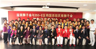 2016年11月14日,深圳狮子会与韩国355-E复合区狮务交流座谈会在深圳市银湖会议中心雅韵厅召开。韩国狮子会355-E复合区总裁陈钟植、副总裁柳元赞等一行42人到访深圳并与深圳领导狮友进行友好交流、探讨。中国狮子联会副会长林子钰,深圳狮子会2016-2017年度会长施建永、第一副会长俞潜、第五会员管理委员会主席李锋,理事、讲师团团长张施俊,会长特别助理林言骤等领导狮友出席会议。会议由林言骤主持。