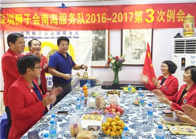 2016年10月28日下午,深圳狮子会南海服务队2016-2017年度第三次例会在龙岗区大芬村书情画境国画专卖店召开。深圳狮子会2016-2017年度第三分区主席操应旺,南海服务队队长何苑珍、第一副队长马峰、第三副队长梁佩霖、秘书徐军、财务刘婕、总务雷四成、纠察陈志祥、理事操华军、廖宗海共10位狮友出席会议。会议由大会主席廖宗海主持。