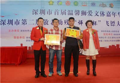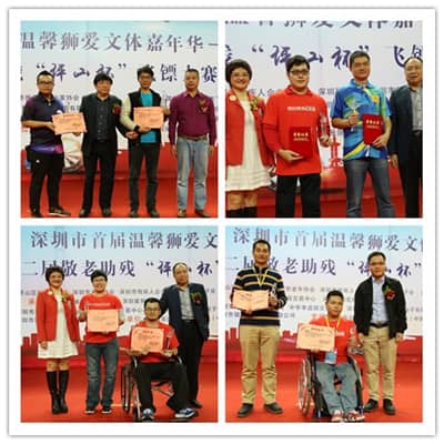 为了更好地关心、关爱残疾人朋友,增强残疾人的自信心,让更多的残疾人近距离融入社会,感受文艺、体育和文化气息,深圳狮子会联合深圳市残疾人联合会举办了深圳市首届温馨狮爱文体嘉年华系列活动。自11月25日启动以来,残疾人趣味运动会、温馨家庭定向寻宝赛、视障人士技能展示活动、残疾人飞镖大赛、残疾人才艺展示“达人秀”、残疾人书画作品展、温馨狮爱公益集市等各项助残活动开展得如火如荼,充分展示了残疾人朋友“自尊、自信、自强、自立”的精神风貌。闭幕式上,施建永会长、曾石养秘书长分别为本次狮爱文体嘉年华系列活动中视障展能趣味运动会金狮奖获得者、定向寻宝赛获奖代表颁奖。
