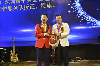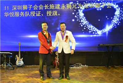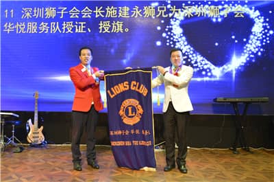 华悦服务队全体狮友在创队队长邓军的带领下集体亮相,并进行入会承诺及就职承诺。各位领导狮友为服务队的新狮友佩戴上新会员章,并欢迎他们正式加入深圳狮子会。施建永会长为华悦服务队正式授证、授旗,为张红象、李锋、雷高清、林馨悦、张施俊、刘建明等指导狮友颁发聘书,感谢他们一直以来对服务的支持和帮助。