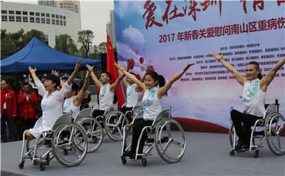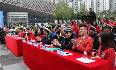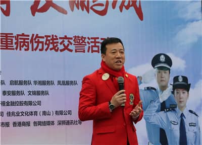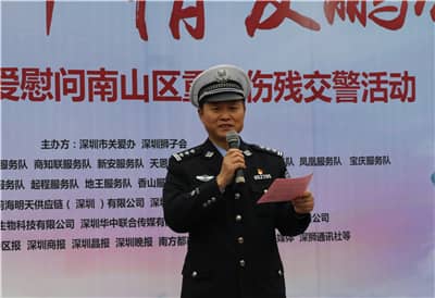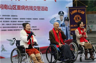 福田区残联张冰等残疾人歌唱演员和“点亮生命”残疾人艺术团精彩的歌唱舞蹈演出拉开了活动的帷幕。在慷慨激昂的国歌声中,众多市民被吸引驻足。主持人高凌作嘉宾介绍,并为在场人员介绍本次关爱活动的意义。他表示,面对繁重的交通管理任务和愈来愈复杂的道路环境,交警们不但要随时面临在执行公务时受伤的危险,还要每天呼吸成几何级数增长的机动车尾气造成的空气污染和被高温蒸腾柏油路面所产生的有毒气体,所以交警不单是人民的“马路天使”,更成为了名副其实的“马路吸尘器”。现如今交警已成为真正的“高强度、高压力、高患病、高风险、低寿命”的四高一低人群,他们亟需得到全社会的理解和关爱。所以,在2017年新春佳节即将到来之际,深圳狮子会和深圳市关爱办共同主办了本次关爱活动,为因公伤病,因公致残的交警同志送上最真挚和温暖的新春慰问。