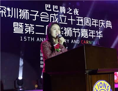 林子钰副会长代表中国狮子联会对深圳狮子会成立十五周年庆典暨第二届华狮节嘉年华晚会的成功举办表示热烈祝贺。她感谢深圳市残联十五年来对深圳狮子会稳健发展的支持与指导,感谢十五年来在公益路上默默奉献、用心付出的深圳狮子会狮友们。深圳狮子会走过十五年的历程,在14位会长的引领下,在5000余名会员共同努力下,一直秉承“正已助人,服务社会”的宗旨,在各个领域取得了辉煌的成绩,得到了广泛好评,树立了良好的公益形象。在中国其他各区及中国狮子联会的发展历程中,深圳狮子会提供了宝贵的经验。因此,尤红会长特送来寄语“砥砺前行十五年,领航公益慈善;夯实聚力再提升,携手创新发展”,给予深圳狮子会充分肯定和厚望。林子钰副会长表示,作为深圳的一名狮友而感到无比的骄傲和自豪。同时,她感谢深圳狮子会在本年度会长施建永的带领下,积极开展“四个千”服务所取得的良好效果,希望深圳狮子会在未来的狮路历程中团结一致、携手共进,共同推动深圳狮子会稳发展,共同思考、探索具有中国特色、深圳风格的狮子之路,向社会传递心中的爱。最后,她感谢本场晚会筹委会的精心筹划与辛勤付出,向所有前台幕后默默付出的狮友们致敬,并预祝晚会取得圆满成功。