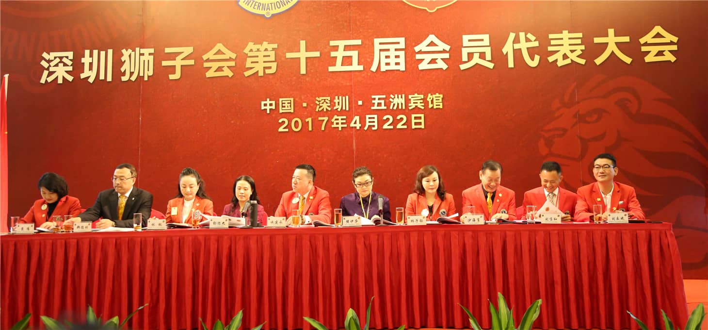 2017年4月22日,深圳狮子会第十五届会员代表大会在深圳五洲宾馆顺利召开。中国狮子联会副会长、深圳狮子会前会长林子钰,中国狮子联会常务理事、中狮基金管理委员会主席、深圳狮子会前会长苏泽然,深圳狮子会2016-2017年度会长施建永、监事长沙海育、上届会长林桃、第二副会长田王星,创会会长谢建文,会长顾问委员会主席、前会长张伟贤,前会长吴晓明、郑德刚、肖兴萍、张国筠、王锦良、孙蕴、戴同鑫,副监事长陈诗君、秘书长曾石养、财务长马敏、总务长骆劲松、纠察长郑和华、常务副秘书长卢锦上等理事会、监事会成员及各服务队会员代表共328人出席会议。中国狮子联会驻深圳首席代表、深圳市残联理事长侯伊莎,中国狮子联会驻深圳代表、深圳市残联副理事长彭迎九,海南会员管理委员会2016-2017年度主席曹国明、第一副主席王劲松、第二副主席刘超等领导、嘉宾列席会议。大会由区年会委员会主席郑德刚,执行主席刘荡和、戴维、刘乐斌主持。
