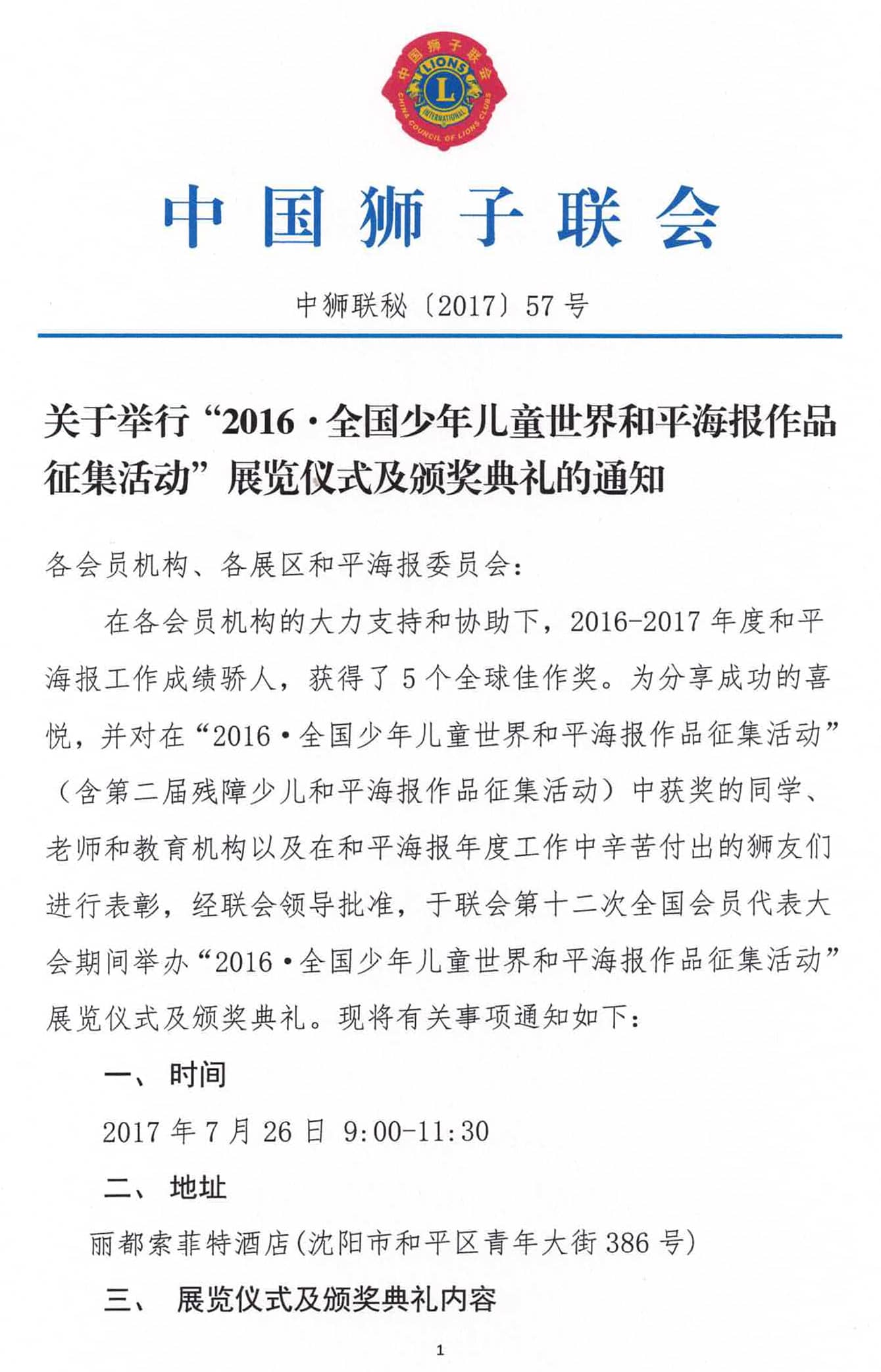 接中国狮子联会《关于举行“2016 全国少年儿童世界和平海报作品征集活动“展览仪式及颁奖典礼的通知(中狮联秘〔2017〕57号)》,和平海报展览仪式及颁奖典礼将于2017年7月26日上午在辽宁省沈阳市召开,邀请获奖同学、老师、教育机构以及表彰狮友、服务队等参加。