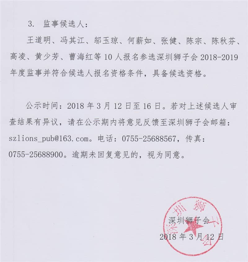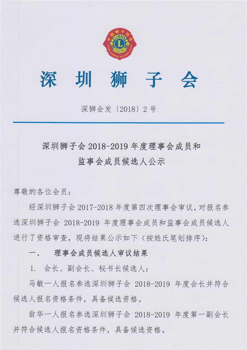 深圳狮子会2018-2019年度理事会成员和监事会成员候选人公示