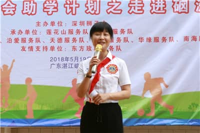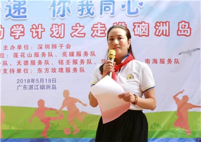 捐赠仪式由孟春主持。捐赠仪式上,莲花山服务队队长陈建军、亮瞳服务队队长孙明霞队长分别发表感言。陈建军队长感谢硇洲岛的领导和居民对活动的积极配合,感恩狮友共同付出,向硇洲岛传递爱心。孙明霞队长表示,硇洲岛的办学条件十分艰苦,学校基础设施都不完善,希望通过此次助学活动,改善孩子们的学习环境,让孩子们的身心得到全面发展。同时,她祝愿孩子们常怀感恩之心,珍惜生活美好,好好学习,回报学校!