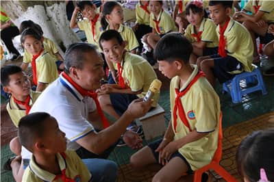 田王星会长发表了热情洋溢的致辞,他感谢老师们的辛勤付出和教育,感谢狮友和企业家们的慷慨解囊,为学校的建设添砖加瓦;希望更多狮友和爱心人士关注硇洲岛,将硇洲岛助学活动延续下去;祝愿硇洲岛的孩子们健康成长,切实牢记“少年强则国强”,早日成为国家栋梁!田王星会长亲切地与三位小朋友聊起长大后的梦想,小朋友们分别说到想当老师、宇航员、明星等,田王星会长也讲述了自己儿时的梦想,鼓励孩子们努力学习、坚定理想。