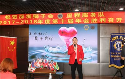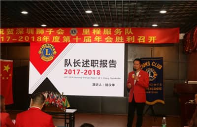 2018年4月14日,深圳狮子会里程服务队2017-2018年度推举大会在罗湖区银湖1号召开。深圳狮子会2017-2018年度监事李超,狮子林项目委员会主席文淑娴、荣誉奖励委员会主席冯其江,国际狮子基金委员会执行主席陈诗君、艺术团副团长侯晓鹏,里程服务队队长杨汉坤、第一副队长杨水金、第二副队长熊琦、第三副队长黄伟强,前队长金倩、文志坚,秘书喻玉湘、财务蔡秀华等130人出席会议。会议由文淑娴担任大会主席并主持。