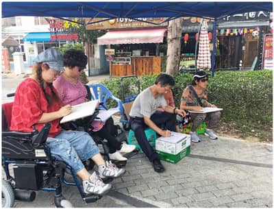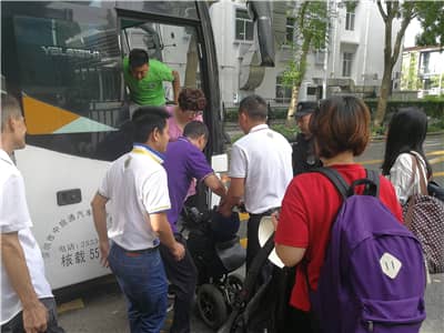 22日上午,福田区残疾人康复中心门口洋溢着暖暖狮爱,深圳狮子会狮爱足球服务队的狮友们有的搀扶着残联书画社的画家们上车,有的在收拾轮椅,有的搬着画具上车……默默为残疾人画家们的海边户外写生活动准备着。