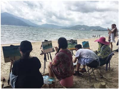 在狮友们的悉心安排下,书画社画家们来到风景如画的较场尾海边。油画组的学员们在于子博老师的带领下,专心致志的描绘着碧海蓝天,迫不及待的想把优美的海滨风景呈现在作品上。国画组的学员们在著名画家黎楚池的指导下,在刘绍兴老师的带领下,神情专注地创作着,诠释着对艺术的执着追求。