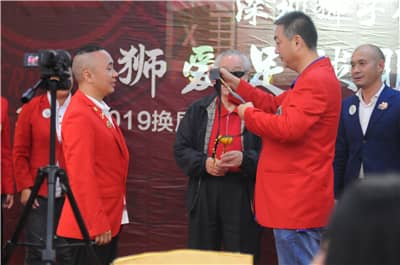 下午,深圳狮子会前会长戴同鑫,2018-2019年度候任第四专区主席杜鹏、候任分区主席李翔、崔伟英,各服务队代表及残联书画社画家们在鹏城人家海鲜酒楼参加了狮爱足球服务队2018-2019年度换届就职典礼。在各位领导狮友的见证下,解彬将绶带和权杖移交给张福龙。新老队长互相交换礼物和年度旗帜。高凌狮兄主持了筹款,现场为狮爱足球服务队品牌项目“狮爱阳光 筑梦绿茵”筹得服务经费5.1888万元。