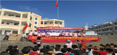9月3日清晨,狮友们来到了助学的第一站——红安县高桥詹店小学。鲜艳的五星红旗飘扬在学校广场,振奋人心的国歌响彻大地,感染着每一位狮友。方校长致欢迎辞,并赠送锦旗。参与活动的服务队向学校授予“共建单位”牌。华商服务队队长戴林华代表狮子会发言。狮友们向红安县高桥詹店小学捐款捐物共计6万元。