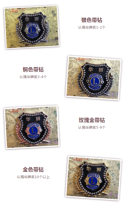 2.累计认捐2~9个“华狮奖”的,可获得依次镶有1~8颗钻的“华狮奖”奖章一枚。