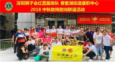 2018年9月19日,深圳狮子会红荔服务队2018-2019年度队长刘小宁等9位狮友来到福田区竹园社区活动中心,开展对接香蜜湖街道康职中心的“2018中秋助残慰问联谊活动”,向职康中心的智障老人及残疾老人送上中秋慰问,向综合康复服务中心捐赠大米、食用油、月饼等物资,服务经费8500元。