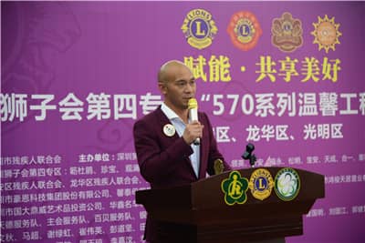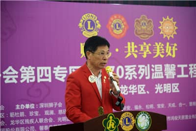 深圳市残联组宣权保部处长黄发科致辞,代表深圳市残疾人联合会向宝安区、龙华区、光明新区的残疾人朋友致以亲切问候,对五大专区主席和深圳狮子会广大狮友开展精准助残工作致以崇高敬意,对深圳狮子会为残疾人事业发展做出的贡献表示感谢,向长期以来重视、支持残疾人事业的社会各界和广大残疾人工作者致以崇高的敬意。