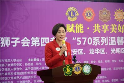 深圳狮子会扶贫助残委员会主席罗观奇介绍“570温馨工程”。本年度,深圳狮子会在深圳市残联的指导下,由五大专区牵头开展了四场“570系列温馨工程”精准助残服务,共向全市551名低保残疾人家庭提供经济帮扶和物资慰问。接下来,深圳狮子会将加大助残力度,尽力帮助残疾人提高生活质量。