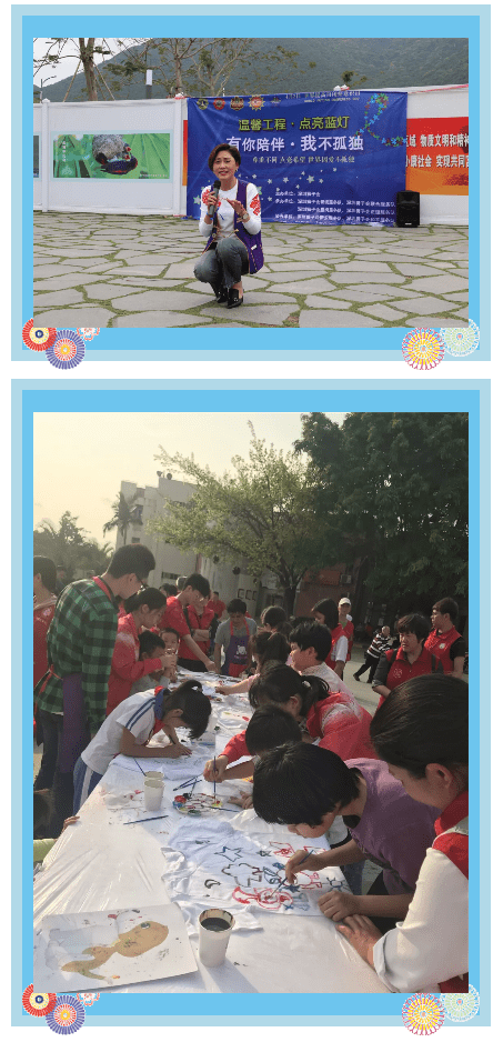 4月2日,深圳狮子会锦绣服务队在深圳大鹏地质公园开展关爱自闭症儿童活动,组织星星的孩子们及其家长一起游览地质公园,开展亲子竞赛、亲子互动等游戏。马敏会长在致辞中表示,呼吁社会各界关注、关爱自闭症儿童。同日,深圳狮子会博雅服务队在南山区桃源村广场开展关爱自闭症儿童活动,组织来自深圳市南山区金色年华特殊儿童康复中心的50名自闭症儿童和深圳卓雅小学的30名小学生开展绘画活动。一笔一色,就在短短的时间内,在这群同龄孩子们的手中,变成了色彩绚烂、想象力丰富的作品,让在场的人们不得不惊叹孩子们的艺术天分。通过活动,促进星星的孩子们与家长之间的交流,让社会各界人士更多地了解、关爱自闭症儿童。