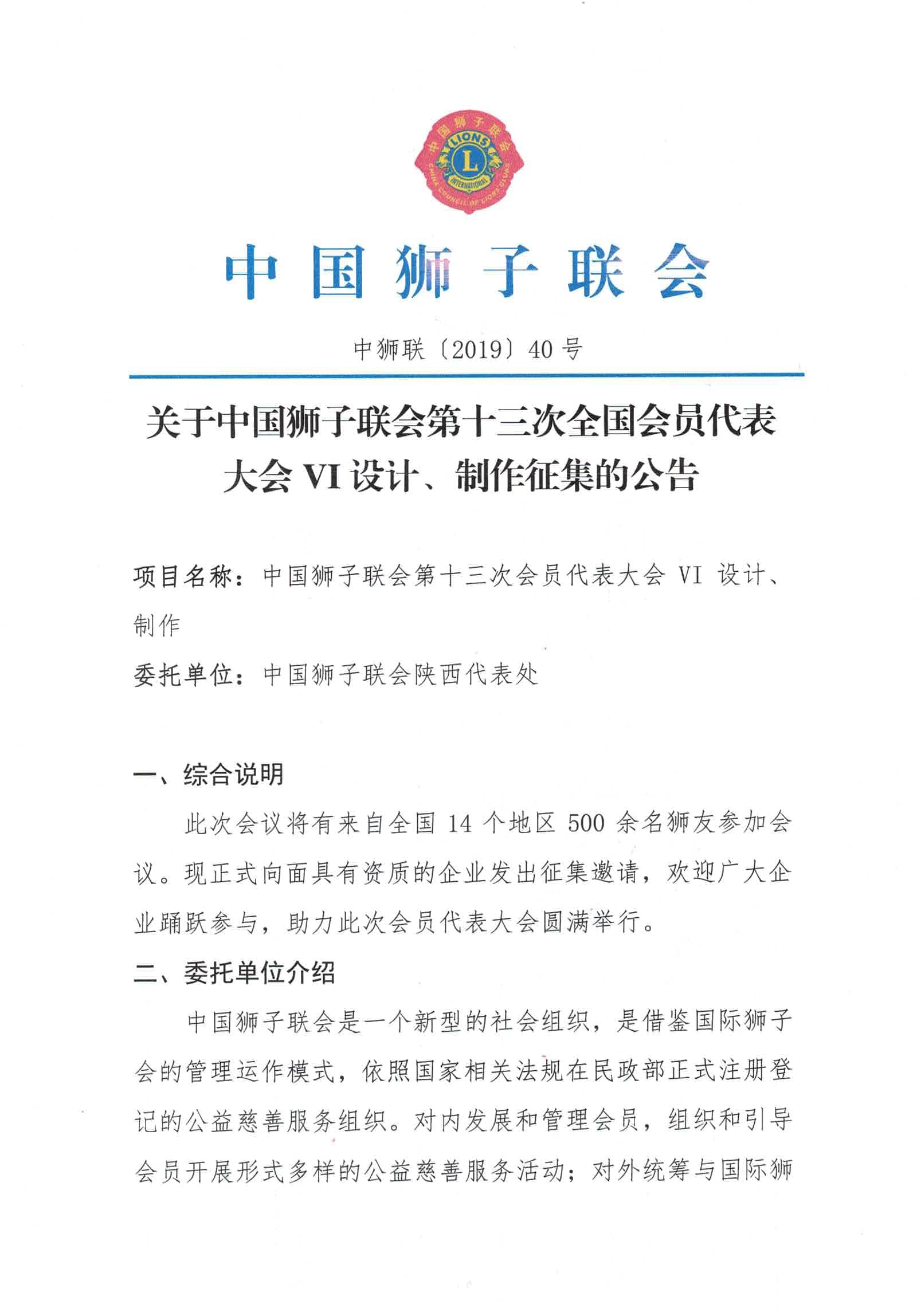 接中国狮子联会的通知,中国狮子联会第十三次全国会员代表大会将于2019年6月3-5日在陕西西安召开,现面向具有资质的企业发出征集VI设计、制作的邀请。现将有关通知转发如下,希望广大狮友积极参与,为中国狮子联会第十三次全国会员代表大会贡献力量。