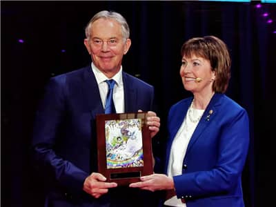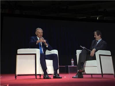 英国前首相东尼·布莱尔的演讲以访谈的形式进行,主持人是布莱尔前竞选主管人阿拉斯泰尔·坎贝尔。布莱尔在访谈中讲述了自己从年少时立志做一位摇滚青年到成为英国历史上当时最年轻的首相,以及卸任后在全球从事公益事业的经历。他根据自己实践经验,对社会组织如何做好与当地政府做好沟通的问题提出自己的建议。他说科技的发展给世界带来了可喜的改变,但科技的进步与保守的政府之间需要相互协调。最后他总结说:你能做的最好的事情就是为他人服务!这正是狮子会“我们服务”的理念。