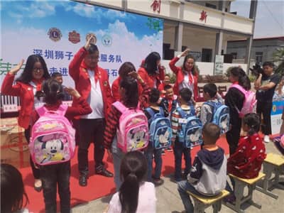 现场,福爱服务队将捐赠物资移交到学校校长手中。学生们热情似火,收到印着迪士尼卡通图案的书包后笑颜逐开,内心充满欢喜。学生代表为狮友们系上了红领巾,让狮友们感受到暖暖的爱意。