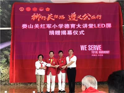 随后,翁华会长、连楚海总领队、任启贤副主任、龚光林副部长在红军小学红色德育主题馆为LED电子显示屏启用揭幕。汇川区教育局、区关工委向深圳狮子会赠送了锦旗。深圳狮子会向娄山关红军小学颁授“狮行长征路”遵义慈善公益行共建单位牌匾。