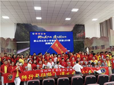 为庆祝中华人民共和国成立70周年,向祖国献礼,2019年9月15日,深圳狮子会华商、盐田、中天、幸福、主会、松岗、正道、银湖、华悦、新安、慈善收藏、泊爱、经典、松明、宏阳、东方玫瑰等23支服务队狮友代表及社会爱心人士共70人前往贵州遵义开展“百队会狮·狮行长征路”遵义慈善公益行活动,向老红军捐赠慰问金,向革命老区学校捐赠校服、书包以及电子教学用品等物资,向贫困学生捐赠慰问金,服务经费60万元。