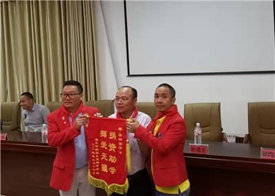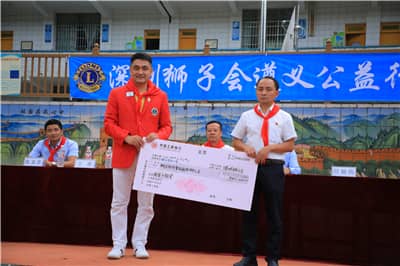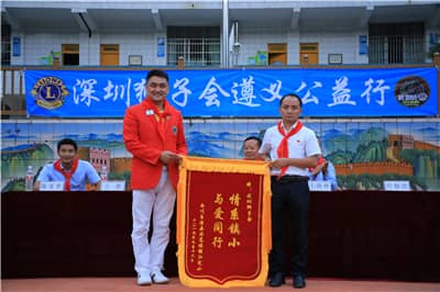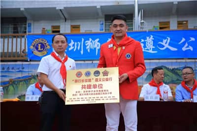 张启波副局长的带领下,深狮通讯社执行主席陈梅红、中天服务队队长余辉驱车近五小时来到距离遵义市近300公里的务川仡佬族苗族自治县镇江村完全小学,向学生们捐赠378副用于英语听力的耳机、300把雨伞,向22名贫困学生每人捐赠1000元,服务经费9.4504万元,并向完全小学赠送“共建单位”的牌匾。为了表示感谢,镇江完小向深圳狮子会赠送“情系村小 与爱同行”的锦旗。学生代表吴晓波向爱心人士表示感谢,并号召全体学生在学习生活中牢记滴水之恩,努力学习,用优异的成绩来报答爱心人士的帮助。