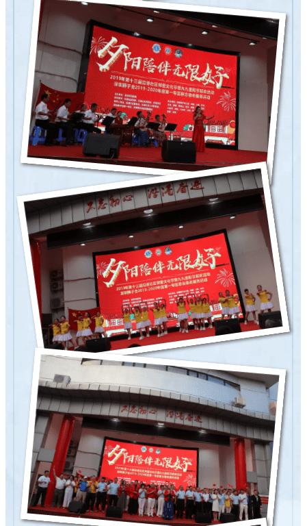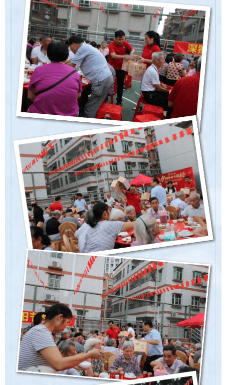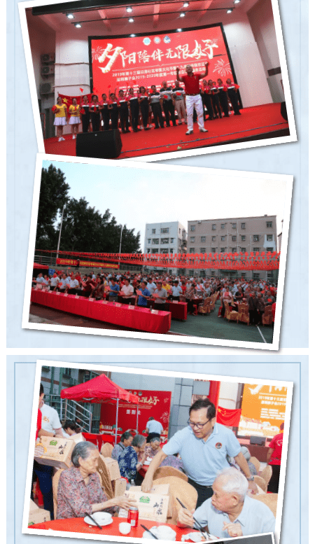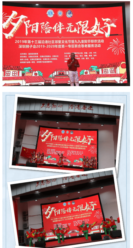 2019年10月16日,由深圳狮子会第一专区发起的“夕阳陪伴无限好”第十三届沿港社区邻里文化节暨九九重阳节联欢活动在盐田区沿港社区党群服务中心球场隆重举行。狮友们与沿港社区400余名老人共度佳节,捐赠了600份长寿面,提供60桌精美客家菜围餐,并向62名长者派发1.27万元慰问金,服务经费17万元。