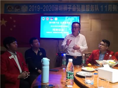 2019年11月15日,深圳狮子会弘雅服务队2019-2020年度第五次队长团队会议暨例会在南山区高新南环路18号阳光带海滨城召开。深圳狮子会第八分区主席、弘雅服务队创队队长唐全慧,弘雅服务队队长姚郴、上届队长徐元虎、第一副队长李丽、秘书赵年真、纠察郑新秀、成员蔡卫华等22人出席会议。深圳狮子会副监事长、弘雅服务队指导狮姐张健,监事何薪如、资政曹严、华侨城服务队队长罗彦贵、华美服务队队长杨博元等5人列席会议。会议由徐元虎担任大会主席主持。
